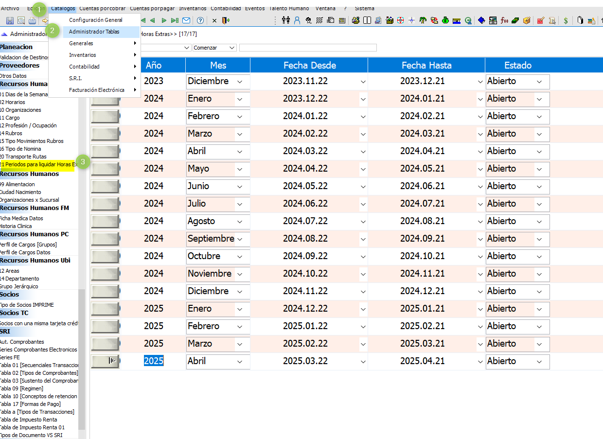 deben ir a Catálogos / Administrador de tablas / RRHH / Periodos para liquidar horas extras