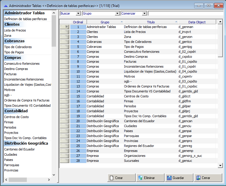 Permite configurar tablas generales para el sistema, por ejemplo Moneda, Impuestos, parámetros.inventarios, contabilidad, etc