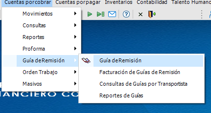 La opción del menú para una Guia de Remisión es por Cuentas por Cobrar / Guía de Remisión Guía de Remisión