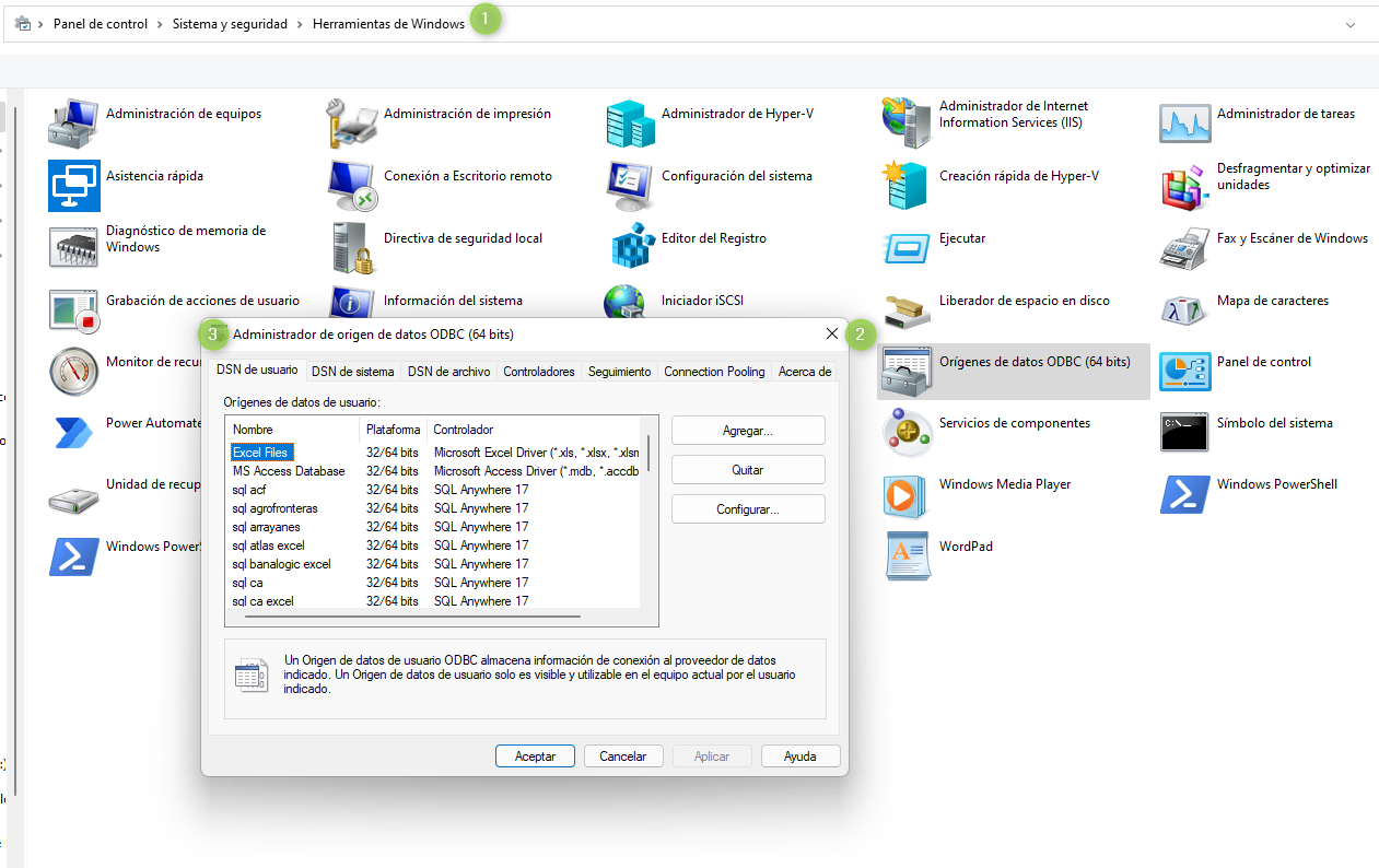 Para configurar la conexión ODBC, debemos ir a Panel de control, Sistema y Seguridad, Herramientas Administrativas, Administrador de Origen de datos ODBC 64 bits,
