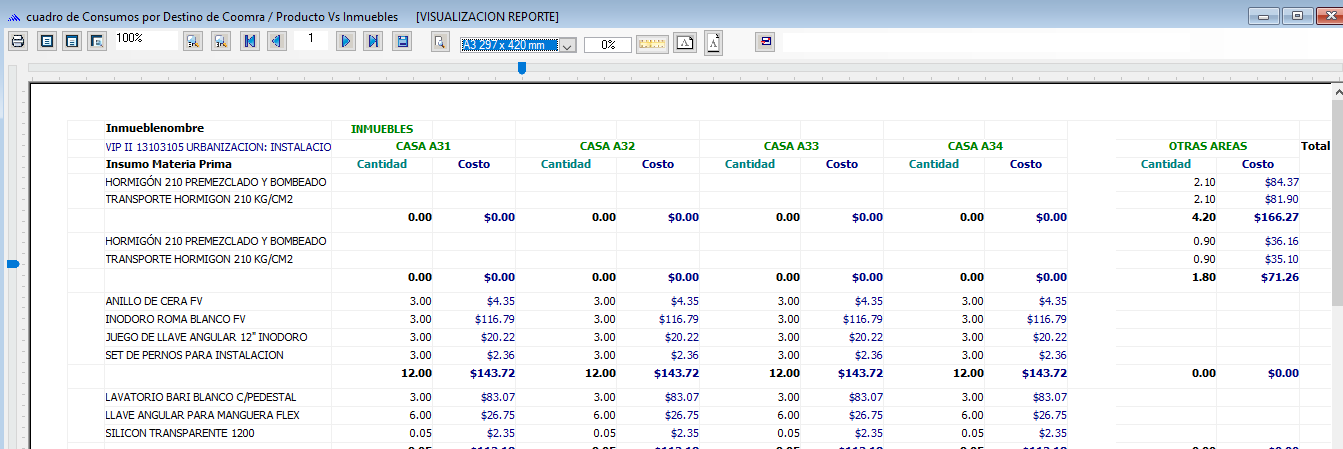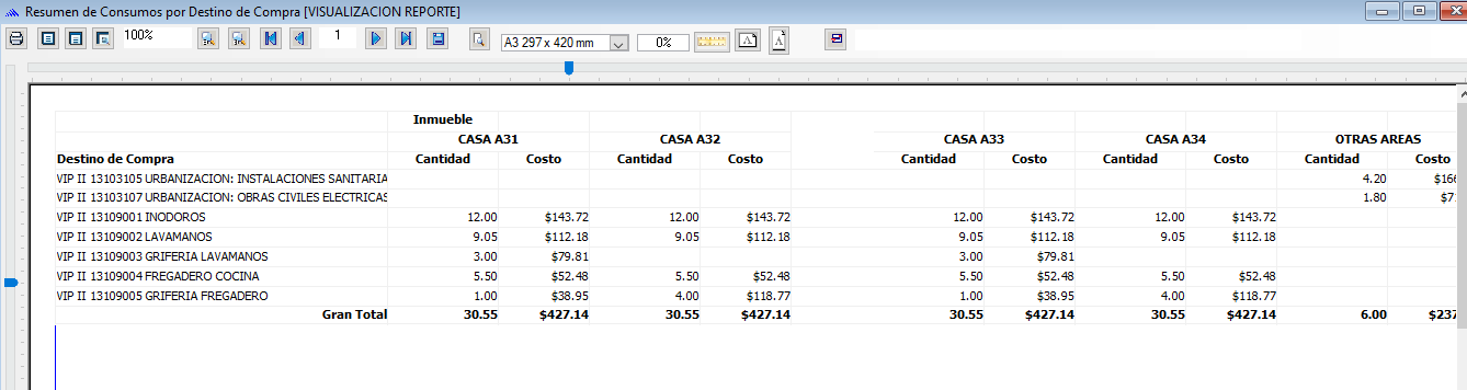 El reporte que se presenta es un cuadro por Destinos de compra Vs Inmuebles y presenta en columnas el total de cantidad y costo de materiales utilizados.