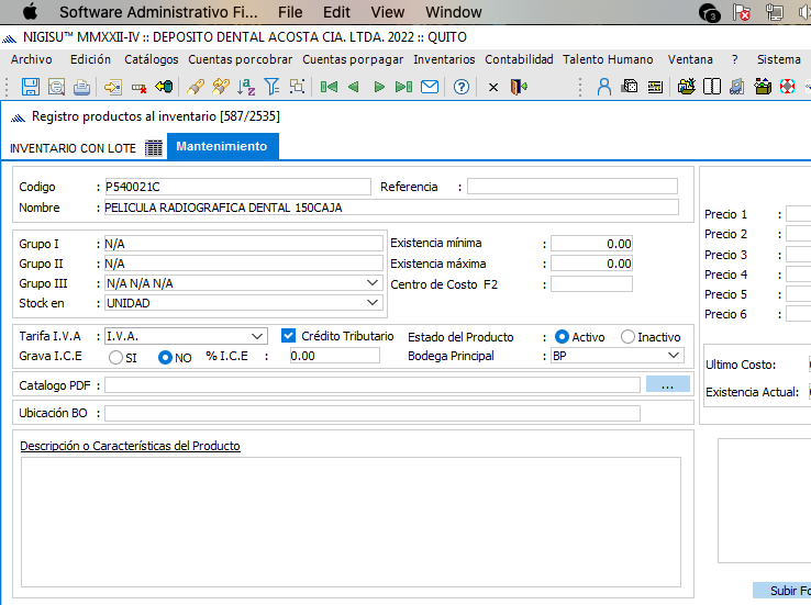 - Luego se pone en el producto en la pestana de presentaciones que se va a vender en el botón mostrar características e insertamos un ítem mas para ingresar la venta de cajas de 150