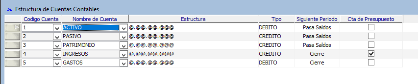 Ejemplo: la cuenta caja chica esta definida como 1.1.01.01 entonces, la estructura de la cuenta Activo debe ser definida asi: @.@.@@.@@, esto permite al sistema validar el ingreso al plan de cuentas garantizando un orden jerarquico.