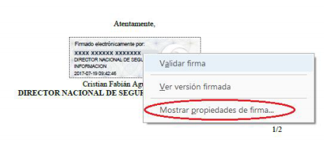 Hacer clic derecho sobre la firma electrónica en el documento digital, luego escoger la opción “Mostrar propiedades de firma…”