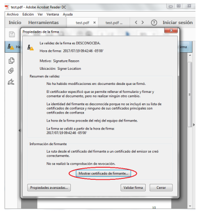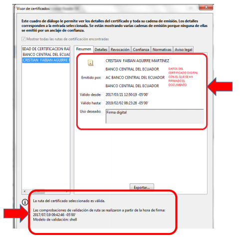 En la parte inferior, se podrá encontrar las comprobaciones de validación de ruta como la fecha y la hora en la que fue firmado el documento.