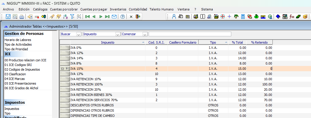 Ir por Catálogos / Administrador de tablas / Impuestos / Impuestos
