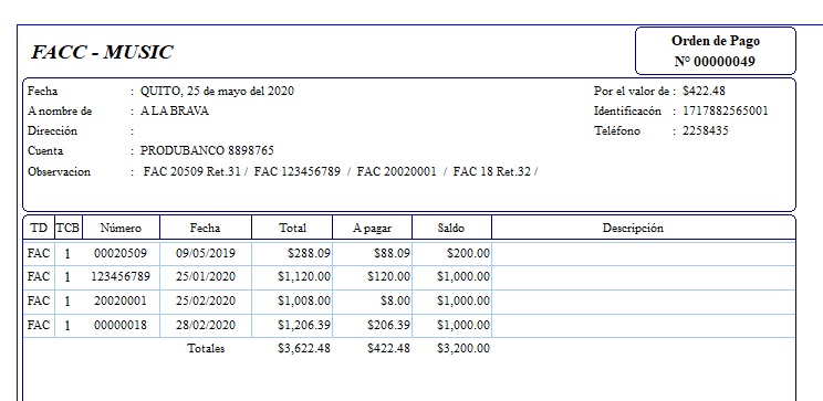 y nos muestra un reporte de orden de pago donde estara detallado que hemos pagado, en caso de que un documento haya sido abonado, nos muetra el saldo de ese documento.