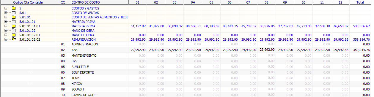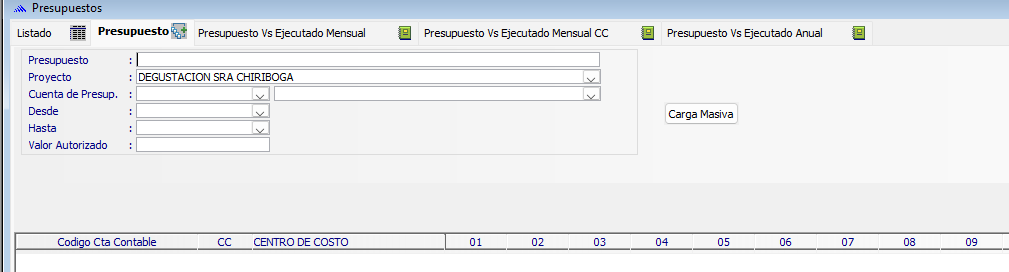 En esta pantalla tenemos una matriz de cuentas contables vs Centros de Costo y Columnas del 01 al 12 que representa a los meses