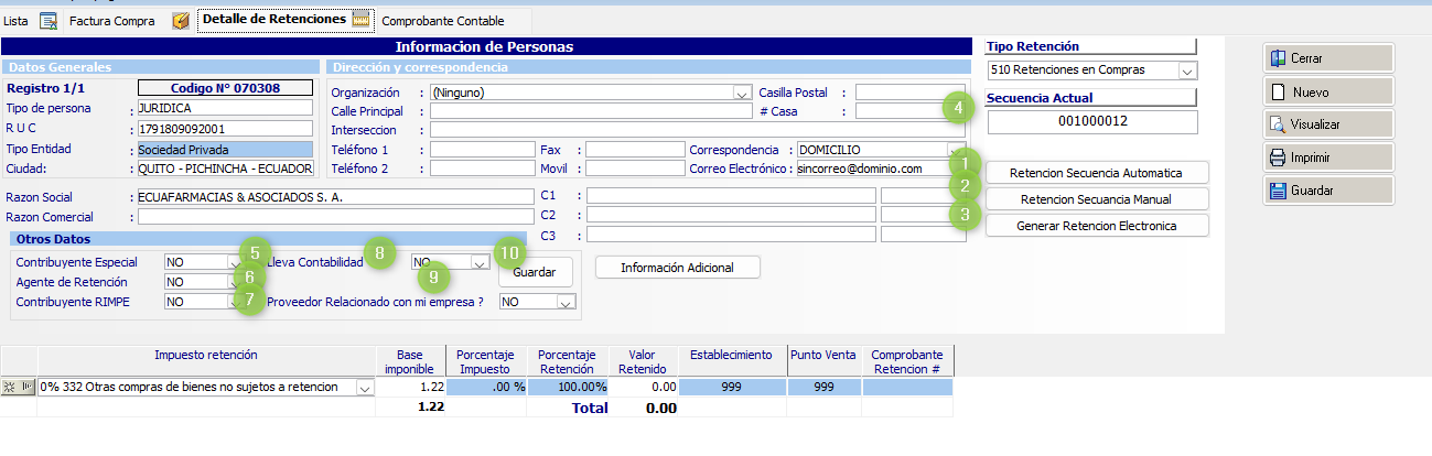 - Retención Secuencia Manual, al dar click en ese boton se pone el numero que esta en el campo 4 y se guarda la retención