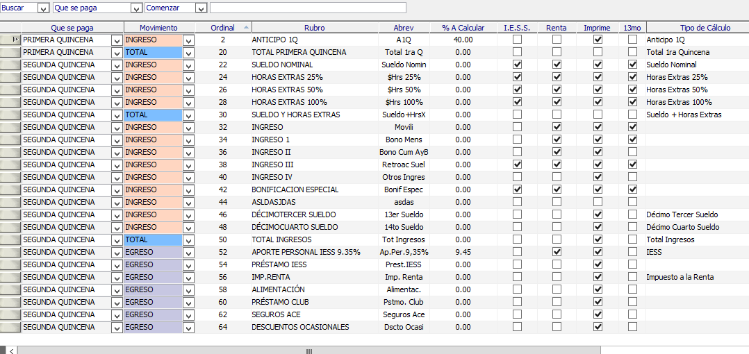 Que se Paga Elegimos el tipo de rol a calcular ( Primera Quincena | Segunda Quincena | Decimos tercero | Decimo Cuarto | Rol Quincenal )